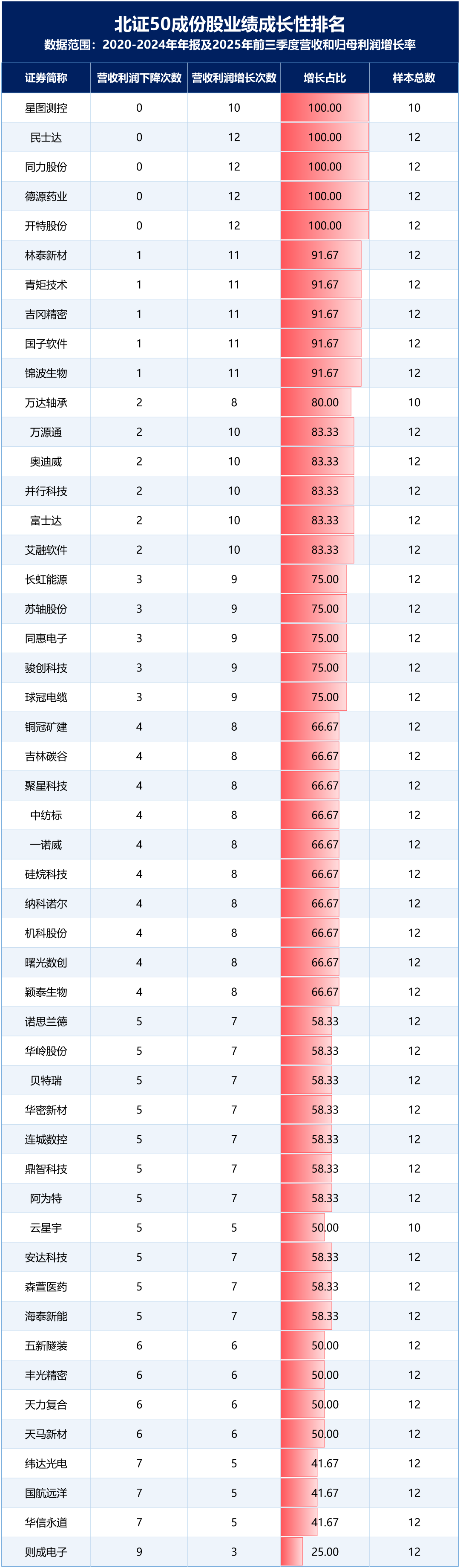 第一梯队(增长占比 100%):包括星图测控、民士达、同力股份、德源药业、开特股份。它们在 2020 - 2024 年年报及 2025 年前三季度的样本周期内,营收和利润从未出现下降(下降次数为 0),增长次数分别达到 10 次(星图测控)或 12 次(民士达等四家),增长占比 100%。这意味着在长达数年的周期里,其业绩持续增长无波动,是北证 50 中成长性最稳定的绩优标的。